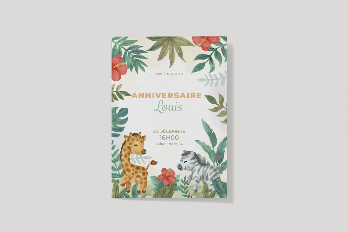 Illustrée avec des animaux adorables (girafe, zèbre), des feuillages tropicaux et des couleurs fraîches, elle est parfaite pour un anniversaire d’enfant.