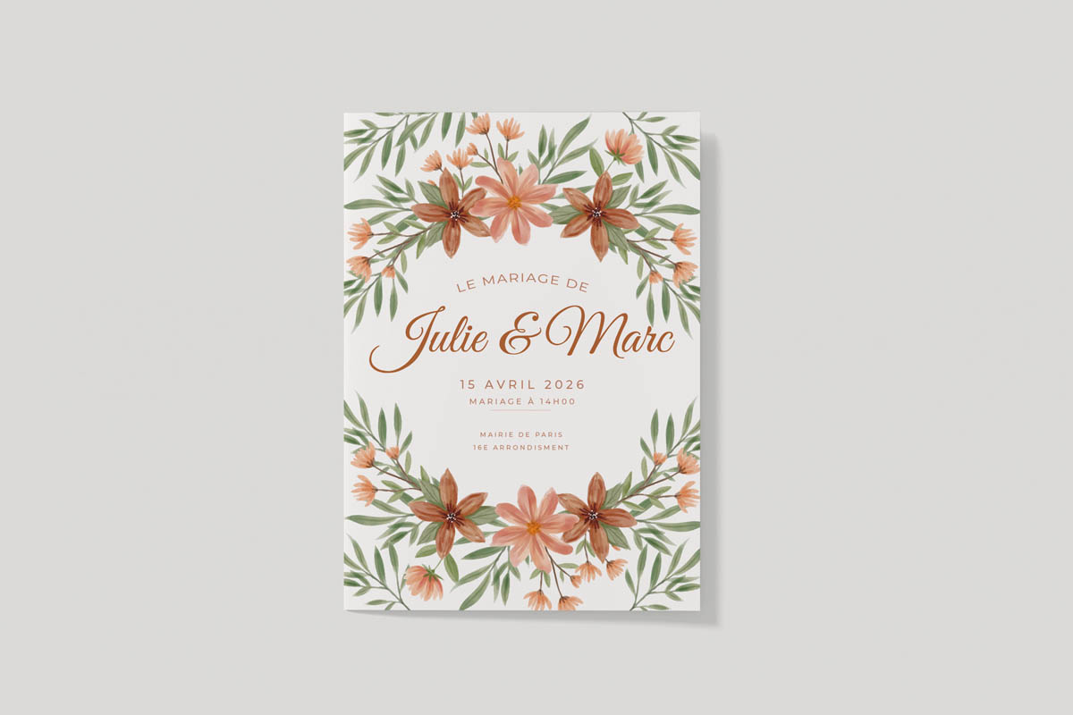 Offrez à votre mariage une touche d’élégance avec cette invitation personnalisée au style floral terracotta, imprimée sur un papier naturel haut de gamme.