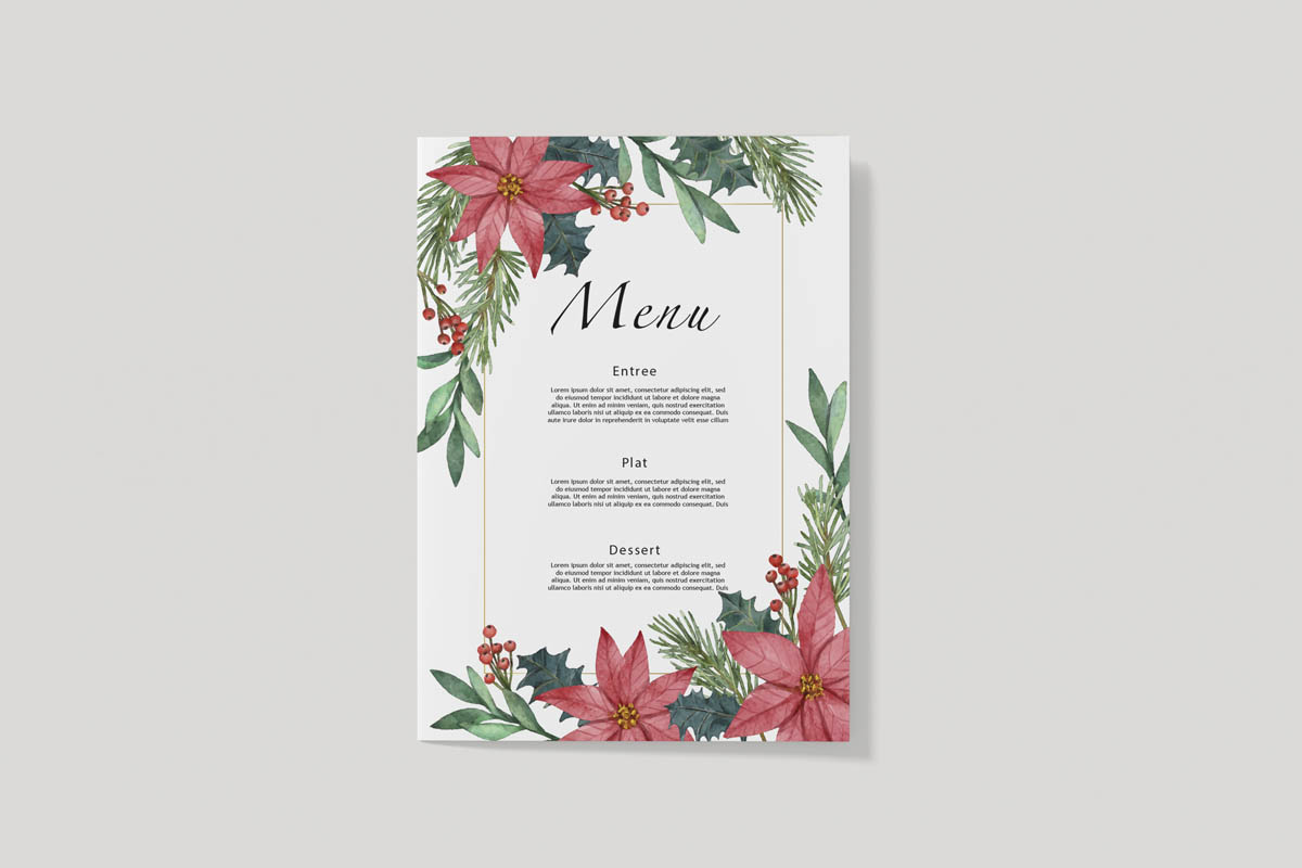 Ce menu de mariage personnalisé – assorti à l’invitation hiver poinsettia – apporte une ambiance chaleureuse et raffinée à votre table.
