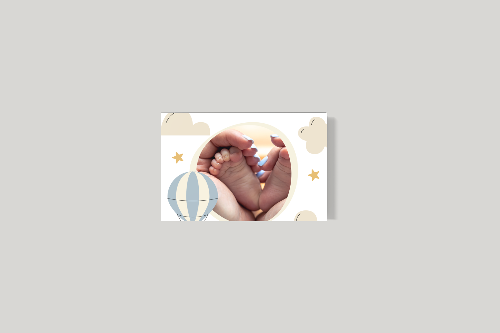 Illustrée de nuages, d’étoiles et d’éléments graphiques aux tons doux beige et bleu, cette création évoque la douceur des premiers instants de vie.